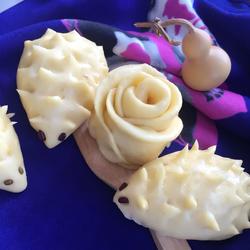 14.Another little hedgehog.Knead 30 grams of dough into a drop shape and cut into small slits with scissors from the back.Taking red beans to make eyes.The cute little hedgehog is ready.