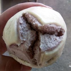 6. Then whitely poke the dough into long strips, cut into small pieces and use a good year stick Roll it into a dough, take purple sweet potato or pumpkin and roll it into a small round.Use white dough to wrap the round like a bun.You can also make it into the shape you like