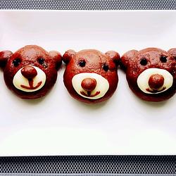 6.Take about 2 grams of chocolate noodles to make the bear's nose, and then Use black beans as an eye dip.Cover the finished bears with a damp cloth and ferment again for 30 minutes.Steam for 20 minutes.Turn off the heat and let it simmer for about 15 minutes before taking it out.