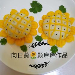 13. Place the white steamed buns with red bean paste filling on the prepared yellow sunflower petals, then roll them into thin strips with yellow dough, and interlace them on the white steamed buns Place it, and finally dot the gaps with black sesame seeds.Success, put it in the pot and steam it for 20 minutes (remember: be sure to sprinkle more dry noodles under the sunflower petals, otherwise it will stick to the chopping board when you are done.)