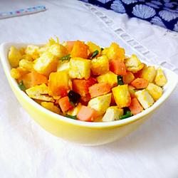 2.Sprinkle the cut diced steamed buns with salt, stir the chicken essence evenly, add oil to the pan, and when the oil is hot, pour in the diced steamed buns