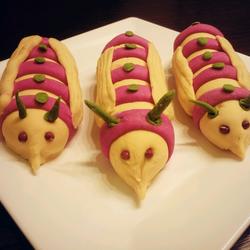 11. Attach the wings, use a green dough to rub them thinly, make small dots and stick them on the back, then use a green dough to make the antennae of the bee.Leave it for twenty minutes, put it in the steamer to steam for fifteen minutes and turn off the heat.After five minutes, open the lid and the bright and beautiful little bees will come out of the pot
