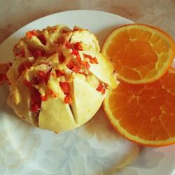 4. Put the diced carrots, ham and mozzarella cheese into the gaps between the steamed buns, brush with egg wash and set aside