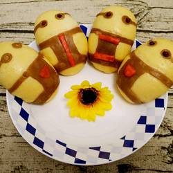 11. Just use red beans to make eyes and embed them in the glasses.Using the same method, I made 3 more minions ~ put them in the pot Let the dough rise for the second time and leave it for 20 minutes~