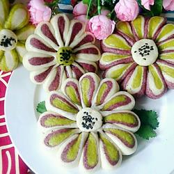 15.Press the 12 small equal parts higher than the center to make 12 beautiful ones.petals, and then put a small white round piece with black sesame on top to serve as the center of the flower