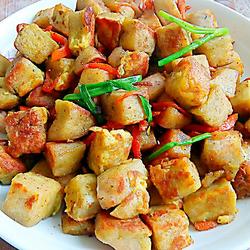 3. Pour the steamed buns into the egg liquid and coat evenly with the egg liquid.Pour oil into the pan and slowly fry the diced steamed buns till brown., crispy