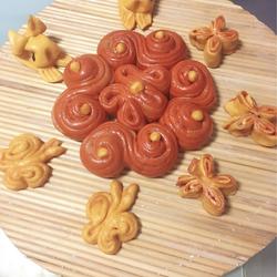 This is what I made [Fruit Style Steamed Buns] 1.Squeeze sweet root vegetables, pumpkin Steam for ten minutes.2 Beetroot juice + flour + yeast dough.3.Use a fruit machine to shake the pumpkin into a finer paste.4.Knead pumpkin puree + flour + yeast.5.Wait 40 minutes for the cooked noodles to ferment.6 Homemade Beetroot Flower Cake.7 Pumpkin Bunny, Pumpkin Butterfly + Pumpkin Butterfly