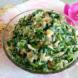 9. The leeks are all covered in oil.Add a little salt.I also added a little chili powder and stir evenly.Add chili powder according to personal preference