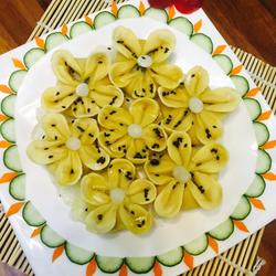 7.After ten minutes, put the fried dumplings into the middle of the plate with a flat-bottomed spatula.Arrange the yellow flower slices and carrot slices as shown in the picture for decoration.When eating, adjust the soup according to your own taste and eat it with a dip