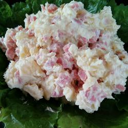 5. Dry the steamed potatoes, crush them, mix them with ham sausage and salad.