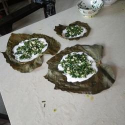 3.The leaves fall into the water, then spread the leaves on the table, powder them, and put them with a spoon Put a spoonful of flour on the leaves without too much flour, then put the stuffing in, and put it in a steamer to steam.