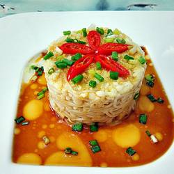 14. Drizzle with light soy sauce and vinegar sauce, sprinkle with green onions, and hang peppers can also be served on the side Embellishment or no embellishment is fine.