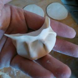 1. Take the dough piece with your left hand, put the dumpling filling on the dough, try to place it in the middle