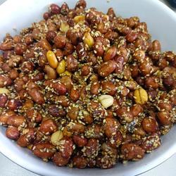 4. Add water to the pot and melt the rock sugar.Turn off the heat, add peanuts, add appropriate amount of sesame seeds, and mix well.