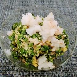 14. Mix minced meat, chopped eggs, diced shrimps, and chopped leeks together, add appropriate amount of salt, minced ginger, light soy sauce, and sesame oil and stir evenly!