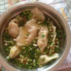 5. Boil the water first, then put the dumplings in the pot and bring to a boil! It's ready when the dumplings float to the surface.Take a bowl and put green onion, oil and soy sauce.Finally, put the cooked dumplings into a bowl.