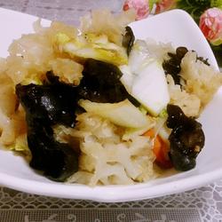 5. Stir-fry for one minute, add vinegar, sugar, light soy sauce, stir-fry well and then add white fungus and fungus Keep stirring!