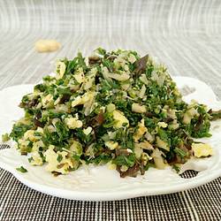5.After the eggs have cooled, add the minced shepherd's purse, fungus, ginger and green onion.Add seasonings to a large bowl.