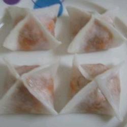 4. Take a radish slice, drain the water, and pat the dry cornstarch on the upward side., and then put the meat filling in the middle.