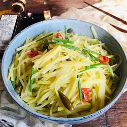 8.Pour in shredded potatoes and pickled pepper water, stir-fry evenly until the flavor is absorbed
