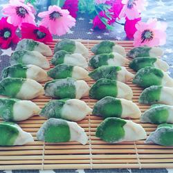 1. Squeeze the juice from water spinach leaves and make dough, and add a piece of white dough2.Knead into long strips