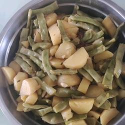 5.Add potatoes and beans and stir-fry for two minutes, then add light soy sauce, dark soy sauce, pepper noodles, chicken powder, and salt and simmer for 15-20 minutes