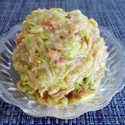 8.Put the zucchini into the meat filling, add sesame oil, onion and ginger and stir evenly.