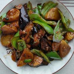 13.Pour in the fried eggplant and potatoes, stir-fry