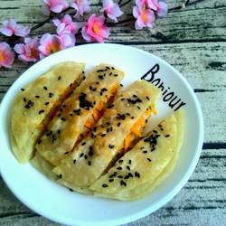 4.One layer of dumpling skin, one layer of carotene filling, one layer of dumpling skin, one layer Layer carotene filling, then a layer of dumpling wrapper, a layer of carrot filling, then a layer of dumpling wrapper, a layer of carrot filling, and finally a layer of dumpling wrapper, press some with your hands, and lightly compact the surrounding sides.