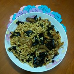 3. Turn on the heat, add oil and garlic, add the prepared ingredients and stir-fry until fragrant.Add some water, add salt and oyster sauce and a little bit of dark soy sauce, then pour the noodles in, then stir-fry until dry.It’s OK once it’s out of the pot