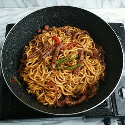 6.After the beef tenderloin changes color, drain the noodles and pour them into the pot.Add the seasonings and continue to stir-fry until the color is even and serve.
