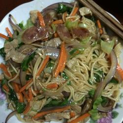 3.Put the noodles into the boiling water Cook until soft and take it out, heat the pan with oil, add ginger and onions and stir-fry, add meat and sausages and stir-fry, finally add noodles, lettuce, salt and light soy sauce to taste