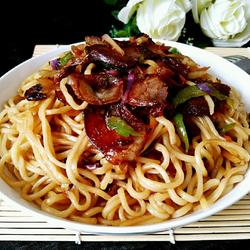 11.Add the water-controlled noodles and the pre-fried sausage, stir-fry evenly