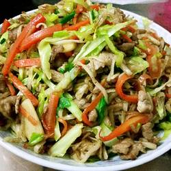2. Cut the carrots and meat into shreds, put them into the pot and stir-fry