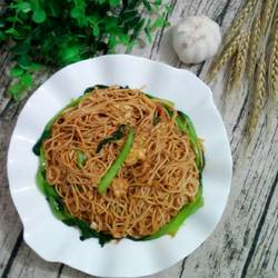 5.Add noodles, chicken essence, very fresh flavor, dark soy sauce, and oyster sauce, stir-fry a few times, take it out of the pot, it is best to stir the pot