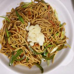 2. Fry the eggs and set aside! Add some oil, stir-fry the onions, green peppers, and radishes until they are raw, and add the pasta sauce! A little dark smoke! Continue to stir-fry.Then add the noodles, add a little salt and sugar and stir-fry the garlic sprouts for 1-2 minutes! That’s it!