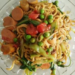 3.Put oil in the pot, add chopped green onion, bean sprouts, green beans, green peppers, ham sausage, tomatoes, add soy sauce and stir fry