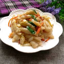 6.Put an appropriate amount of oil in the pot, first add the sausage and stir-fry, then add shredded cabbage and carrots Silk.