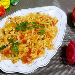 The noodles should be cooked firmer to make them more chewy.When frying shredded onions and tomatoes, you need to control the heat to get a better texture.