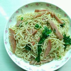 6. Heat the oil in a pan and fry the lettuce until cooked, add salt, then pour in the ham and continue frying