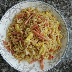 7.Put an appropriate amount of drained noodles, eggs, garlic chili sauce Stir-fry with salt