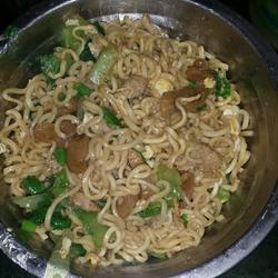 8.Pour all the ingredients into the noodles and stir-fry for a few times.Add salt, MSG, green onions and soy sauce.