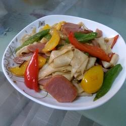 Colored peppers must be fried for 6 minutes first, so that they are cooked at the same time as the dough.This is a quick dish, stir it quickly over high heat.When frying, be sure to add a few drops of water in the middle, otherwise it will easily stick to the pan!