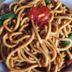 3. Put an appropriate amount of oil in the pot and heat it (raw) The oil needs to be boiled! ) Add the tomatoes to the pot and stir-fry twice quickly, then add the braised soy sauce (don’t put too much, the braised soy sauce is very dark in color, be careful that your noodles turn into black noodles), then add shredded green peppers and stir-fry quickly.