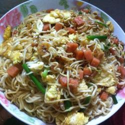 6.As shown in the picture: put in the ironed Noodles, stir-fry for one minute, add fried eggs and sausage, add a little soy sauce, stir-fry evenly