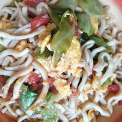 7. After the tomatoes are fried to produce juice, add noodles and eggs.
