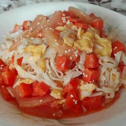 9. When the carrots are fragrant, add the noodles and stir-fry together, then add an appropriate amount of thirteen Flavor, salt.