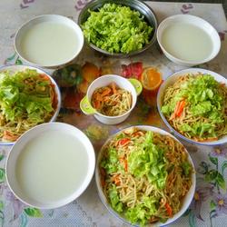 Noodles ( Moderate amount ) | Tomatoes, onions, red peppers, ham, onions, lettuce, green peppers, eggs, green vegetables (appropriate amount) |