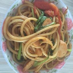 3. Heat the pan, pour oil, and add tomatoes, rapeseed, ham sausage, and noodles one after another.Add dark soy sauce, salt, and chicken essence before serving.