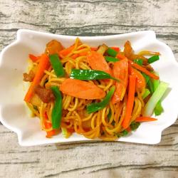 1.Pour the alkaline noodles through water and put them in a bowl for later use.Shred carrots, cut onions into sections, shred meat, and cut sausages with an oblique blade